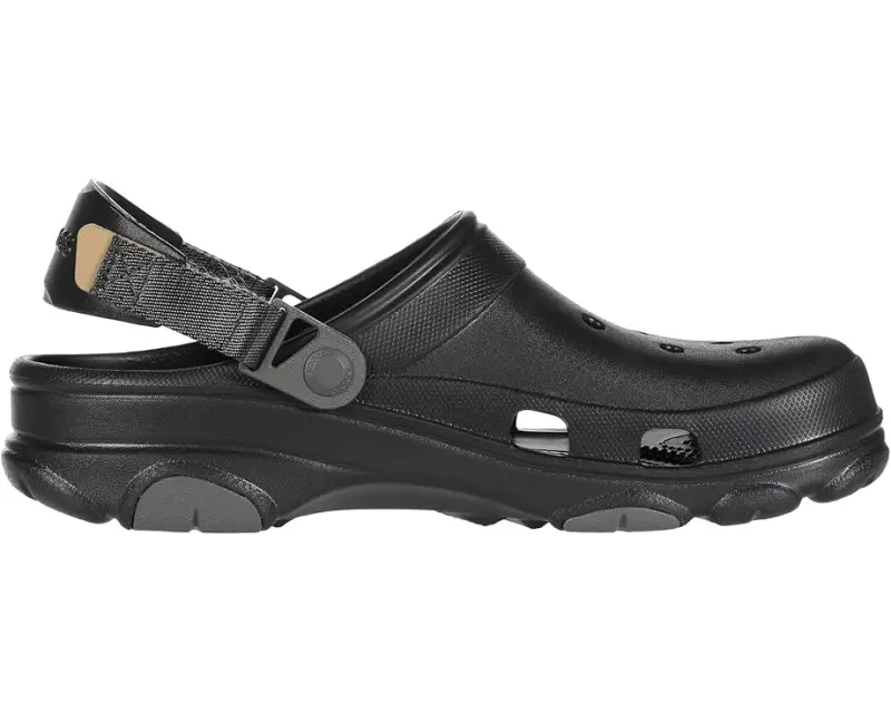 • Travel. exploration. adventures near and far. The Classic All-Terrain Clog is ready for it all, even in the harshest environments. With a more rugged outsole and an adjustable turbo strap, the ground beneath your feet has never felt more surmountable. Lightweight Croslite™ construction makes them a practical and packable choice for any outing. It's time to shift into all-wheel drive. Flip that strap back and go find your fun!